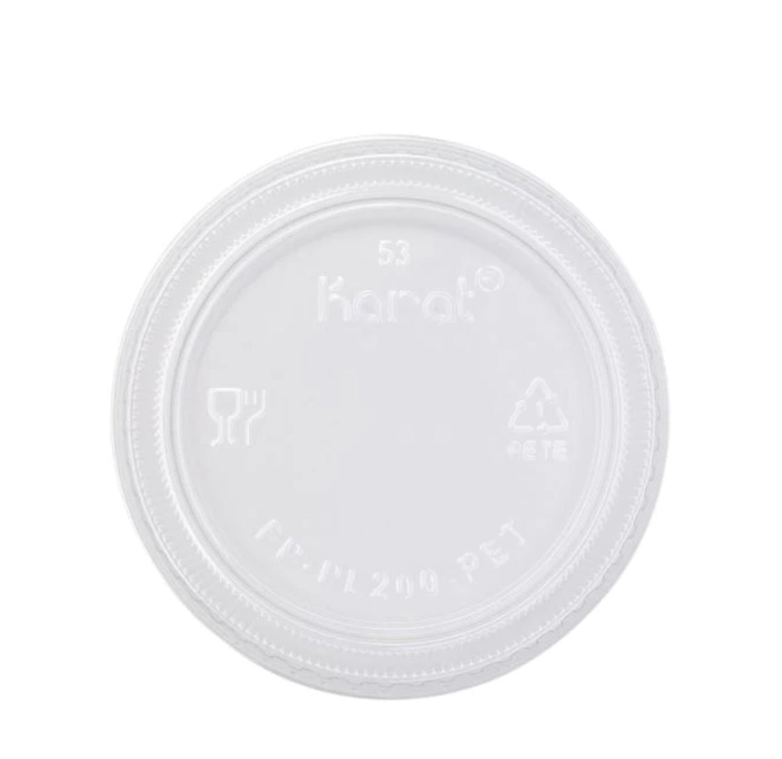 Get peace of mind when you top your 2 oz plastic portion cup with a Karat PET portion cup lid. These offer a secure seal on 1 oz, 1.5 oz, and 2 oz portion cups.