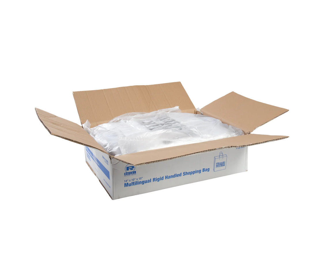Rigid Handled Multilingual Shopping Bags are made from high-density polyethylene and are ideal for carrying take-out orders comfortably. These bags feature convenient rigid handles to make transporting food items a snap and are recyclable for maximum convenience. Perfect for holding everything from warm meals to cold takeout, high-density polyethylene bags have a higher heat threshold than low-density polyethylene bags. Durable and reliable, these bags are a must-have for any takeout location or restaurant.