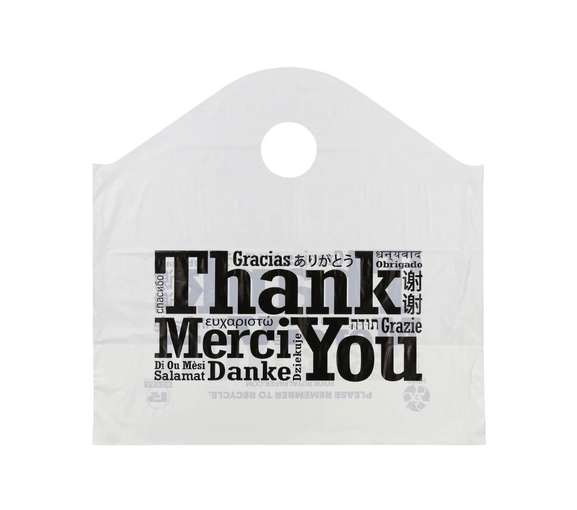 Wave Top Handled Multilingual Bags are made from high-density polyethylene and can easily be placed on counters to make packaging takeout orders a breeze. Our takeout bags are perfect for comfortably carrying to-go orders. These bags feature a wave top handled design for easy transport. Perfect for holding everything from warm meals to cold takeout, high-density polyethylene bags have a higher heat threshold than low-density polyethylene bags. Durable and reliable, these bags are a must-have for any takeout location or restaurant.