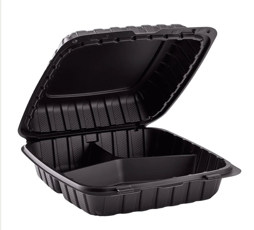 9" x 9" Mineral Filled PP Hinged Container, 3 compartment, Black - 120 pcs