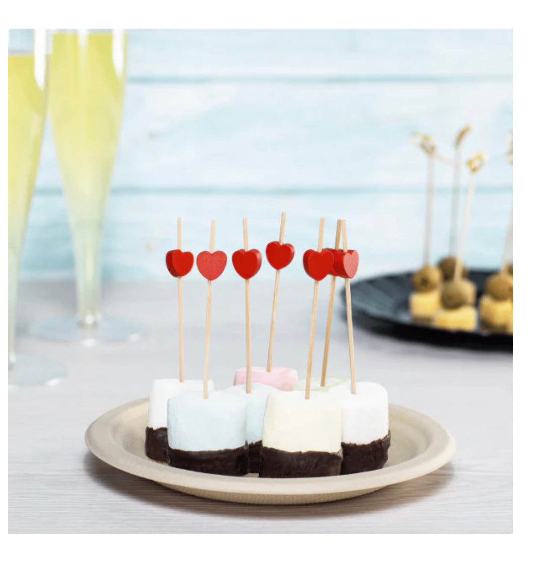 3.5" Bamboo Red Heart Picks are biodegradable and provide a bold sweetheart design to food platters, garnishes, and more!