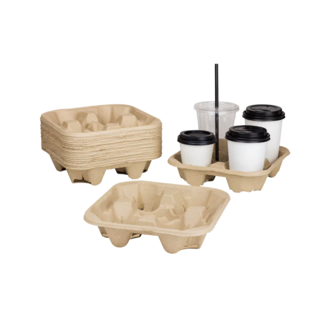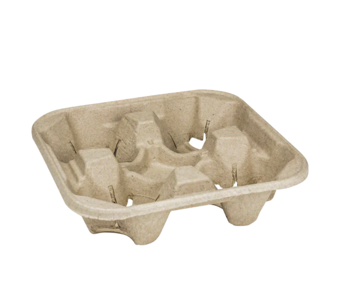Biodegradable Cup Holder/Carrier is made from a molded fiber to form a 4 cups holder. It is also available in a 2 cup holder.