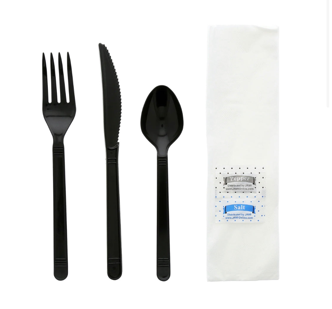These Heavyweight PP Cutlery Kits contain a black plastic fork, teaspoon, and knife, as well as salt and pepper packets and a 13" x 17" paper napkin. Cutlery kits are wrapped to ensure they stay sanitary prior to use, and can easily be placed in takeout packaging. They offer convenience for staff and customers and are a perfect option for any takeout or delivery food establishment.