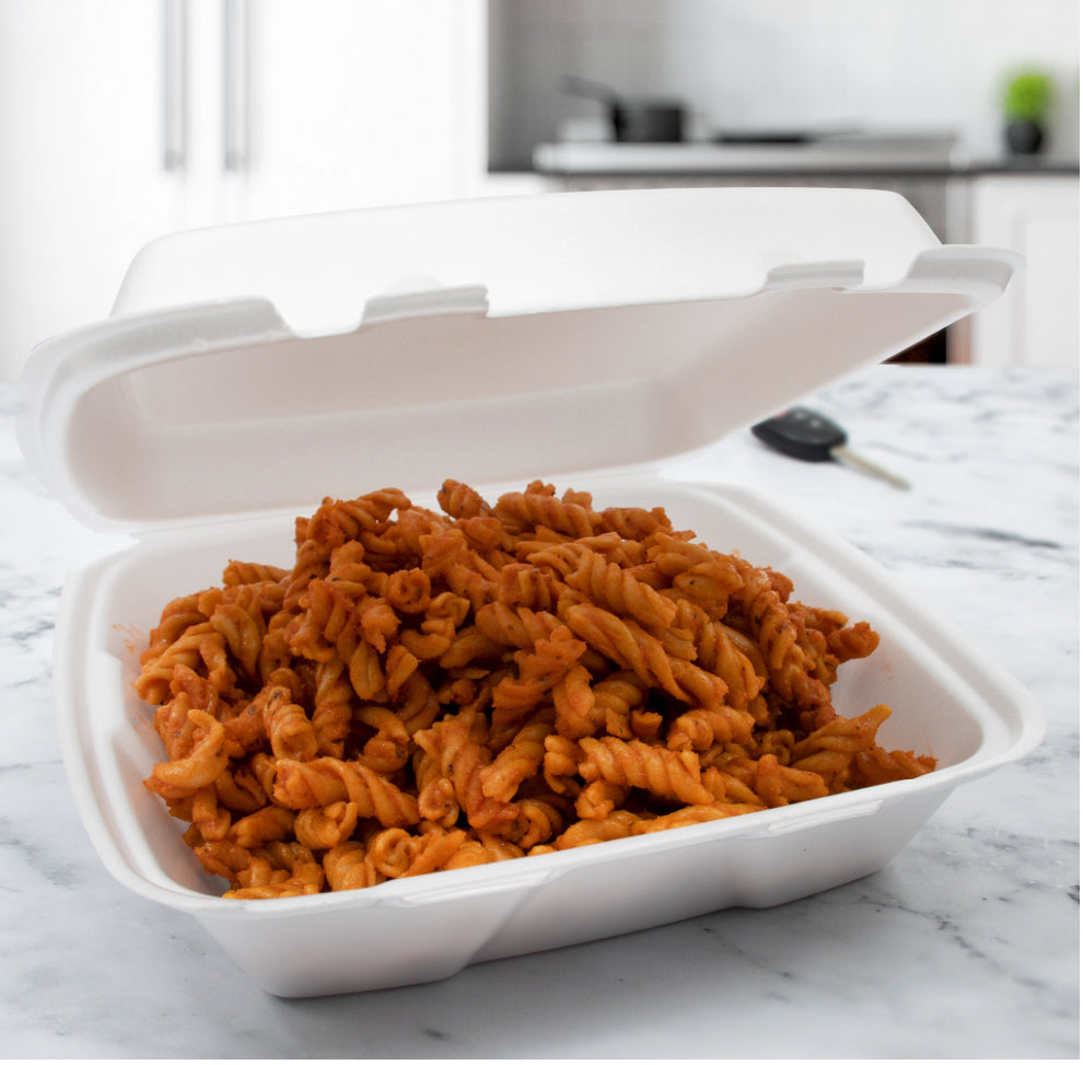 Perfect for street tacos, Buffalo chicken wraps or fresh side salads! Foam hinged lid containers are a classic option that works well for delivery and to-go orders. Saucy foods stay contained thanks to the non-absorbent foam. Avoid messes in transit with a container that securely stacks and closes. Count on this 9-inch foam hinged container for a reliable dining experience every time!
