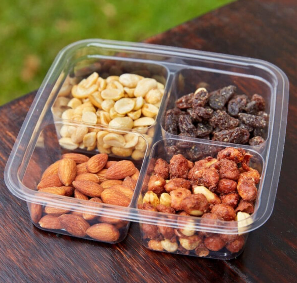 Separate your deli's most popular menu items with this Fabri-Kal Greenware GS6-4S 16.7 oz. shallow 4-compartment clear PLA compostable container. Featuring four square compartments, this container is perfect for separating equal quantities of food, ideal for patron's picnics, lunches, or on-the-go snacks. The compact 6" square shape makes it perfect for convenience stores, markets, cafeterias, and grocery stores selling petite pre-packaged foods. Pair it with Fabri-Kal Greenware LGS6 clear lid to preserve your food's flavor, block airborne contaminants, and stack several containers for maximized room in your refrigerated display cases. It's also great for spill-free transportation! Designed to tolerate 40 to 104 degrees Fahrenheit, this 4-compartment container is ideal for packaging cold foods. No matter if you're using this container to distribute cold cuts or deli salads at your picnic or concession stand, you can't go wrong!